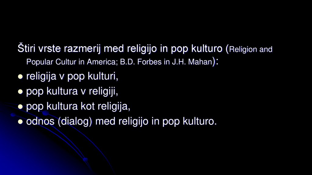 Štiri vrste razmerij med religijo in pop kulturo (Religion andPopular Cultur in America; B.D. Forbes in J.H. Mahan):