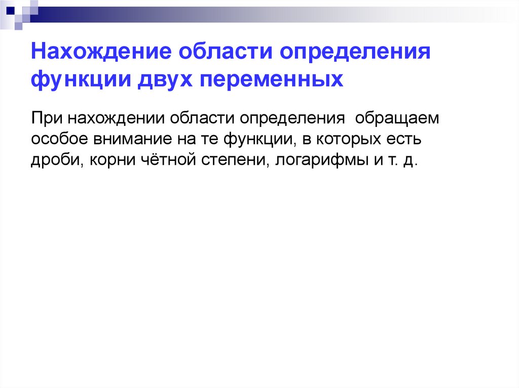 При нахождении области определения обращаемособое внимание на те функции, в которых есть
