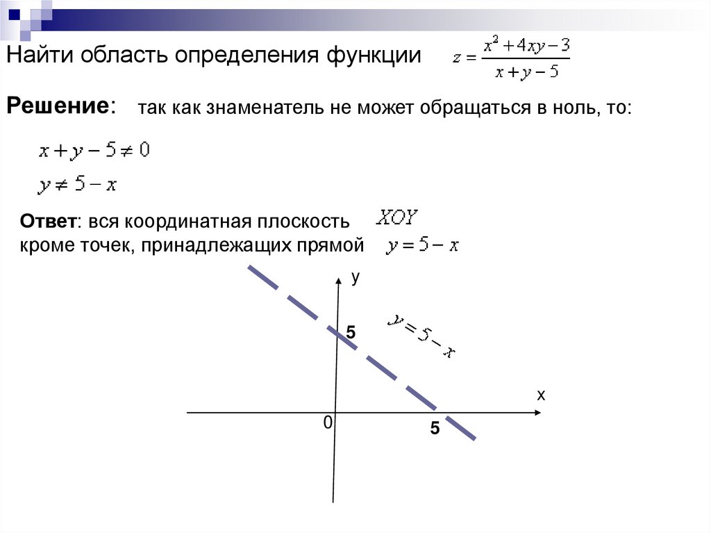 Найти область определения функцииРешение: так как знаменатель не может обращаться в ноль, то: