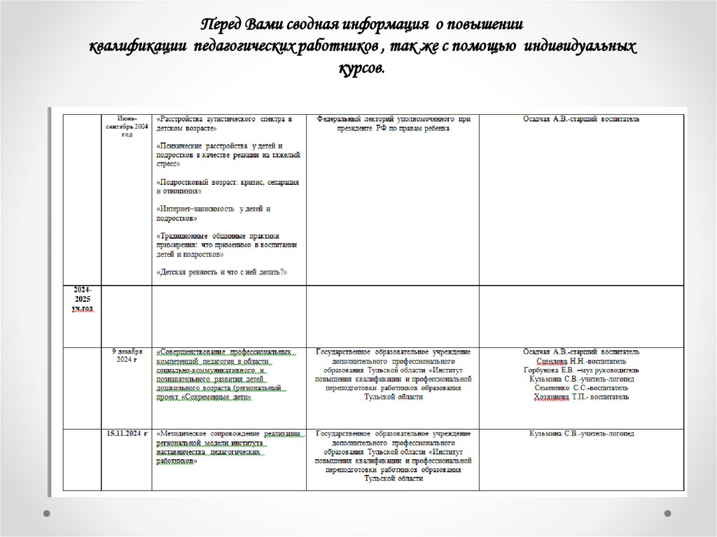 Перед Вами сводная информация о повышенииквалификации педагогических работников , так же с помощью индивидуальных