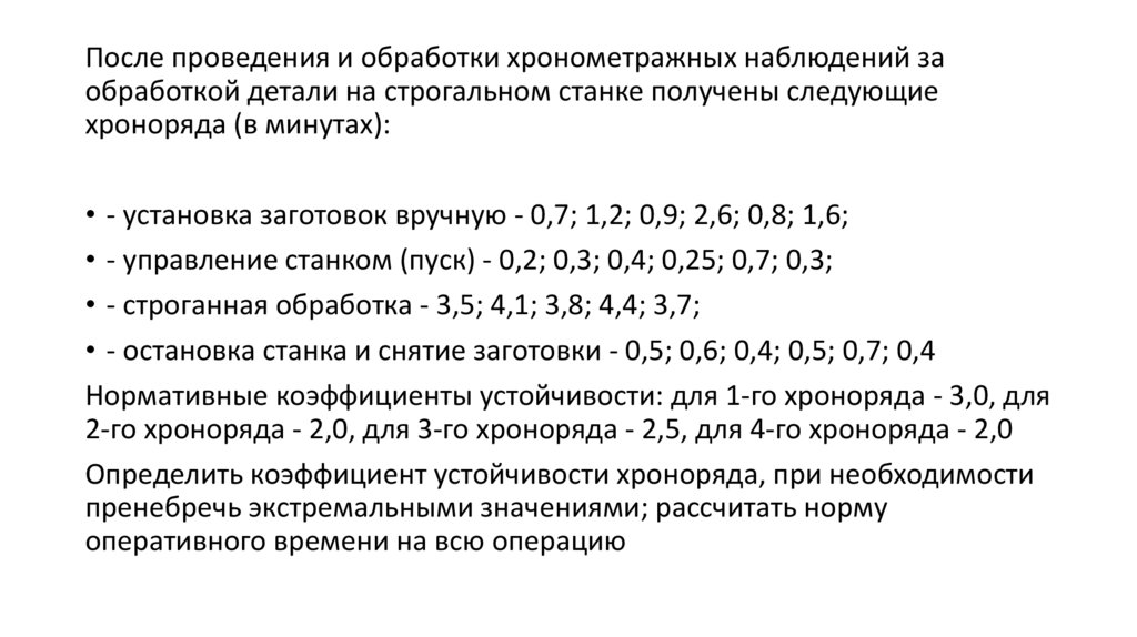 После проведения и обработки хронометражных наблюдений заобработкой детали на строгальном станке получены следующие