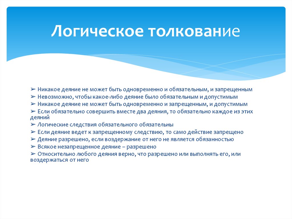 Логическое толкование представляет собой разъяснение и уяснение смысла и содержания норм права с помощью