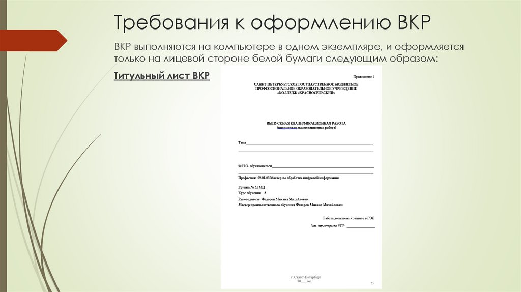 ВКР выполняются на компьютере в одном экземпляре, и оформляетсятолько на лицевой стороне белой бумаги следующим образом: