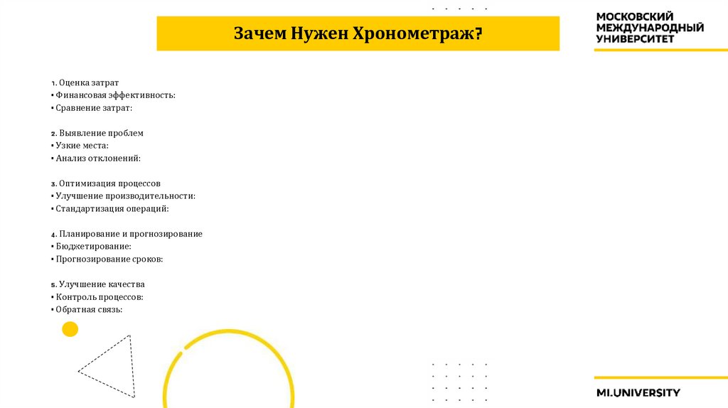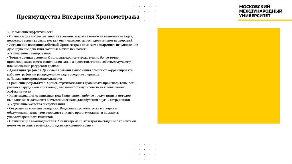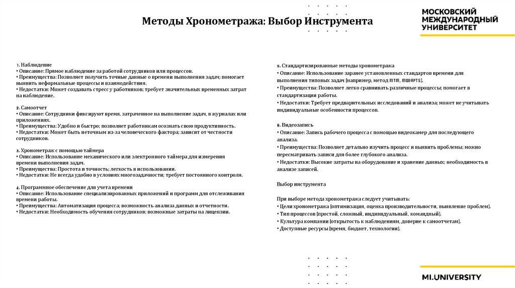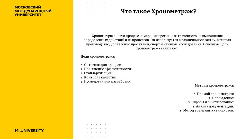 Хронометраж — это процесс измерения времени, затраченного на выполнениеопределенных действий или процессов. Он используется в различных областях, включая