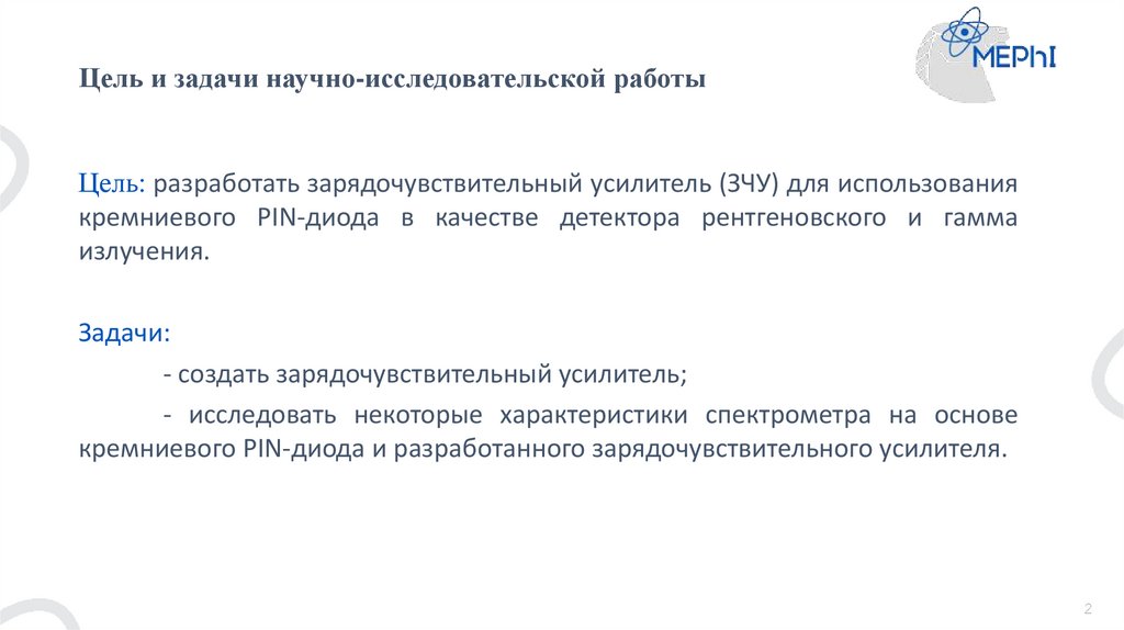 Цель и задачи научно-исследовательской работыЦель: разработать зарядочувствительный усилитель (ЗЧУ) для использования