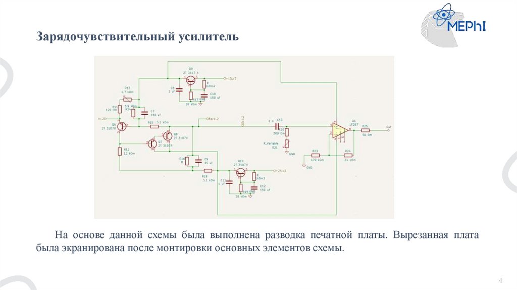 Зарядочувствительный усилительНа основе данной схемы была выполнена разводка печатной платы. Вырезанная плата