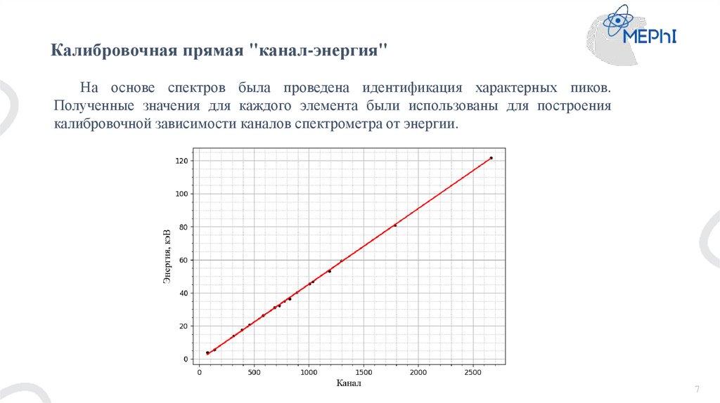 Калибровочная прямая "канал-энергия"На основе спектров была проведена идентификация характерных пиков.