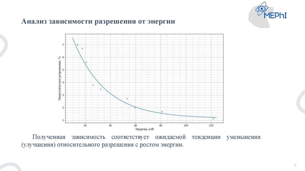 Анализ зависимости разрешения от энергииПолученная зависимость соответствует ожидаемой тенденции уменьшения