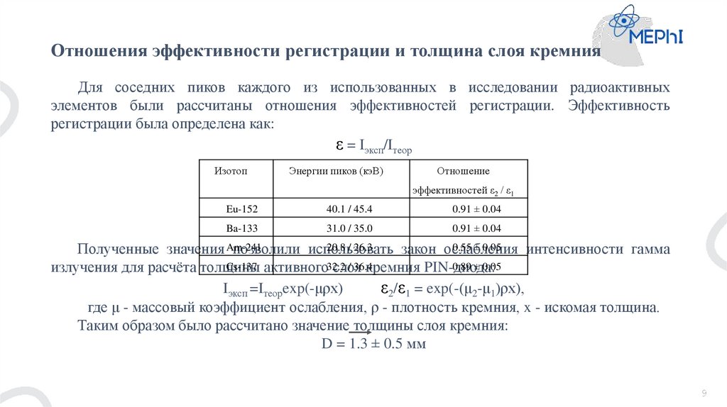 Отношения эффективности регистрации и толщина слоя кремнияДля соседних пиков каждого из использованных в исследовании радиоактивных