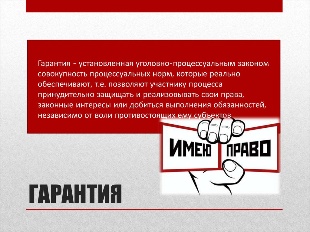 • Гарантия - установленная уголовно-процессуальным закономсовокупность процессуальных норм, которые реально