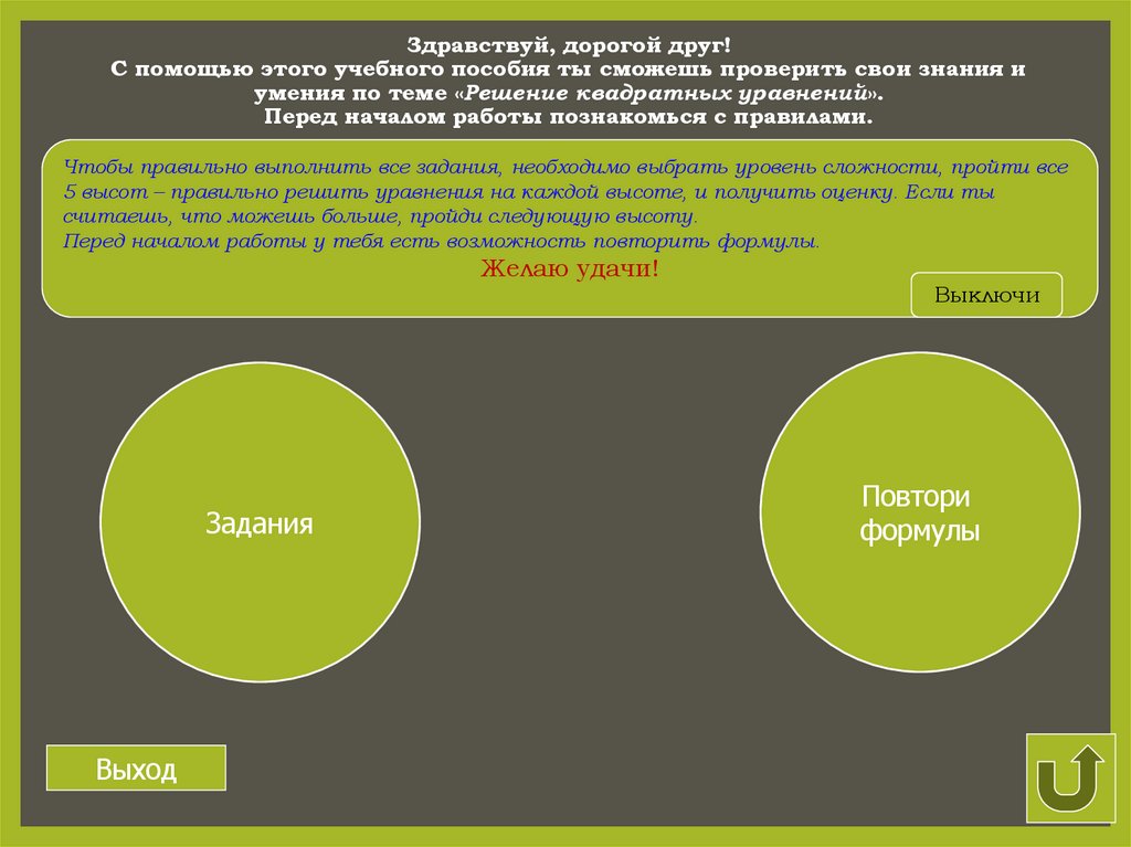 квадратных уравнений».Перед началом работы познакомься с правилами.