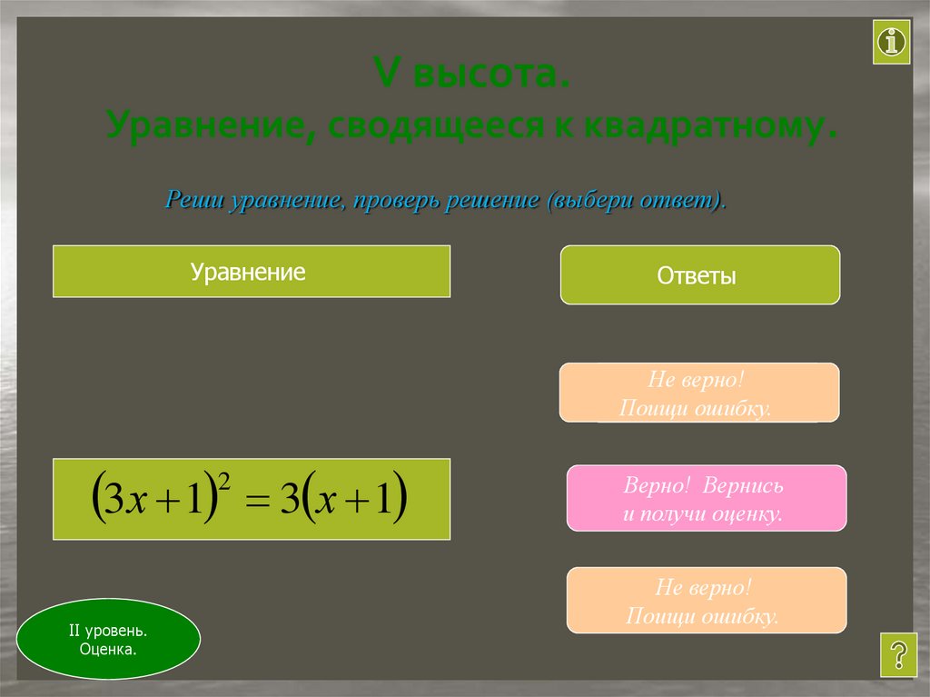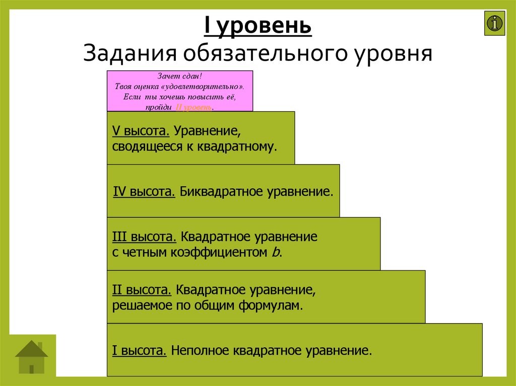 5 высот – правильно решить уравнения на каждой высоте, и получить оценку. Если ты