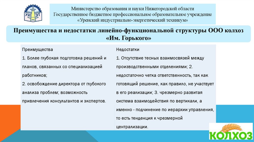 Преимущества и недостатки линейно-функциональной структуры ООО колхоз