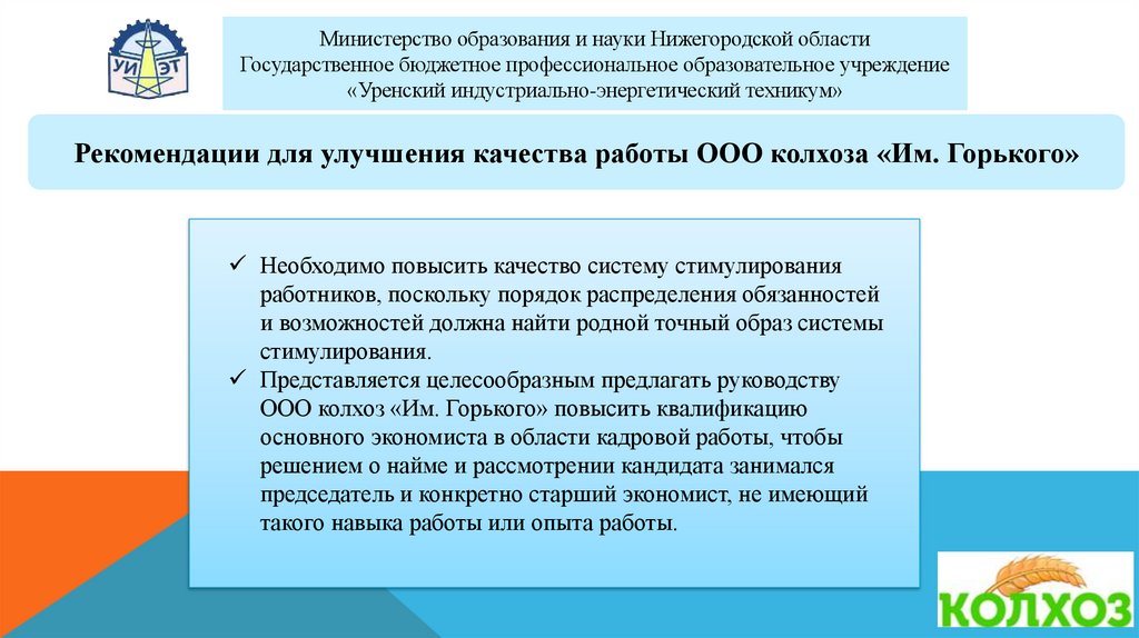Рекомендации для улучшения качества работы ООО колхоза «Им. Горького»
