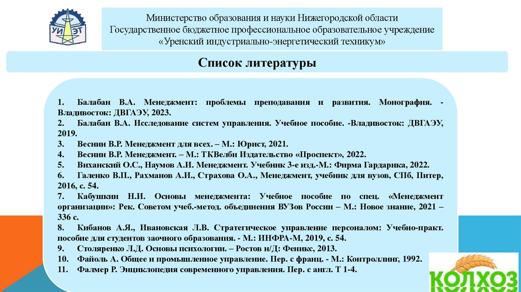 5. Виханский О.С., Наумов А.И. Менеджмент. Учебник 3-е изд.-М.: Фирма Гардарика, 2022.