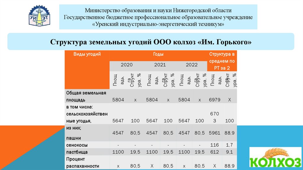 Структура земельных угодий ООО колхоз «Им. Горького»