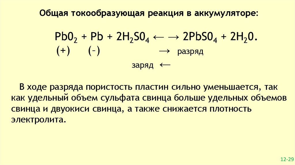 Общая токообразующая реакция в аккумуляторе:Рb02 + Рb + 2H2S04 ← → 2PbS04 + 2H20.