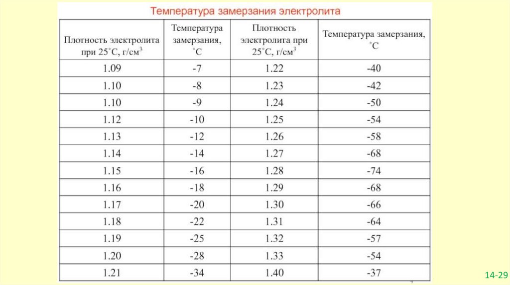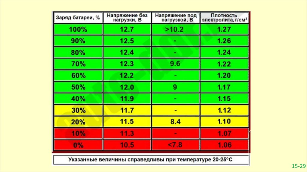 Плотность электролита полностью заряженной АКБ зависитот района эксплуатации и изменяется от γ=1,25 г/см3 в жарком