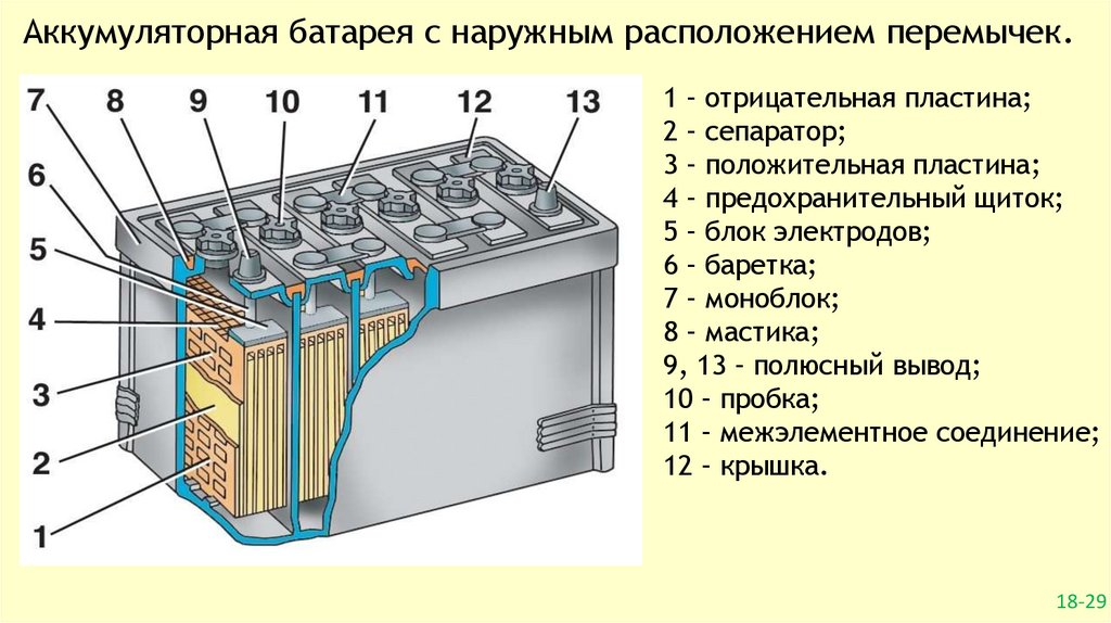 Аккумуляторная батарея с наружным расположением перемычек.1 – отрицательная пластина;