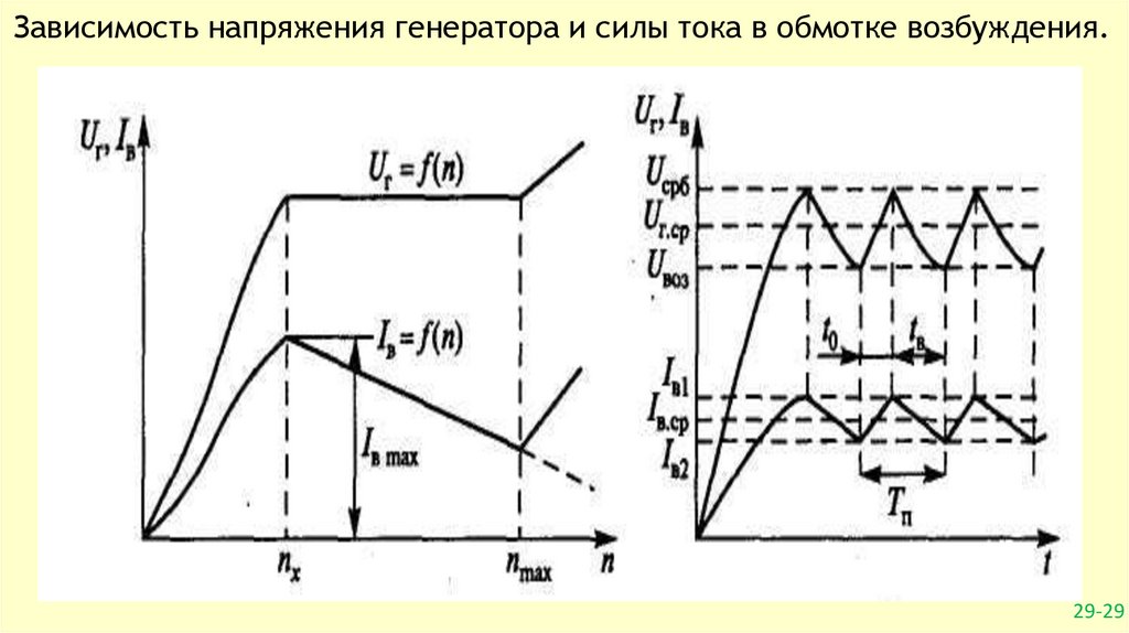 Зависимость напряжения генератора и силы тока в обмотке возбуждения.29-29