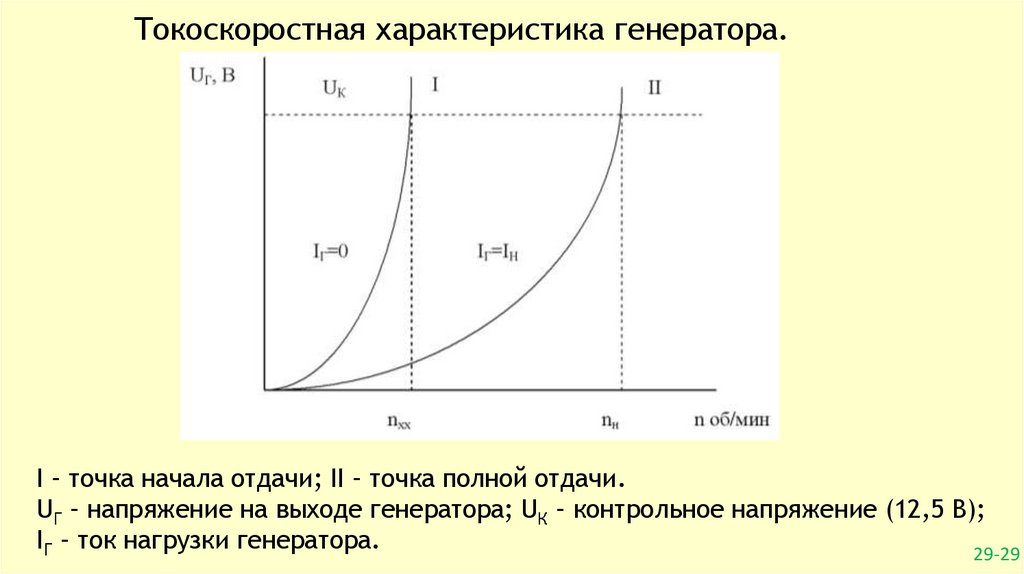 Токоскоростная характеристика генератора.I – точка начала отдачи; II – точка полной отдачи.