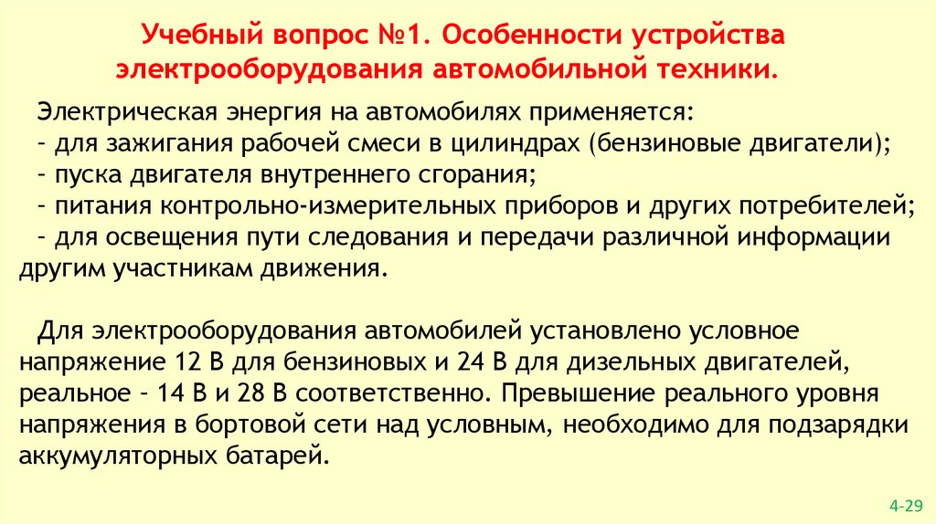 Учебный вопрос №1. Особенности устройстваэлектрооборудования автомобильной техники.