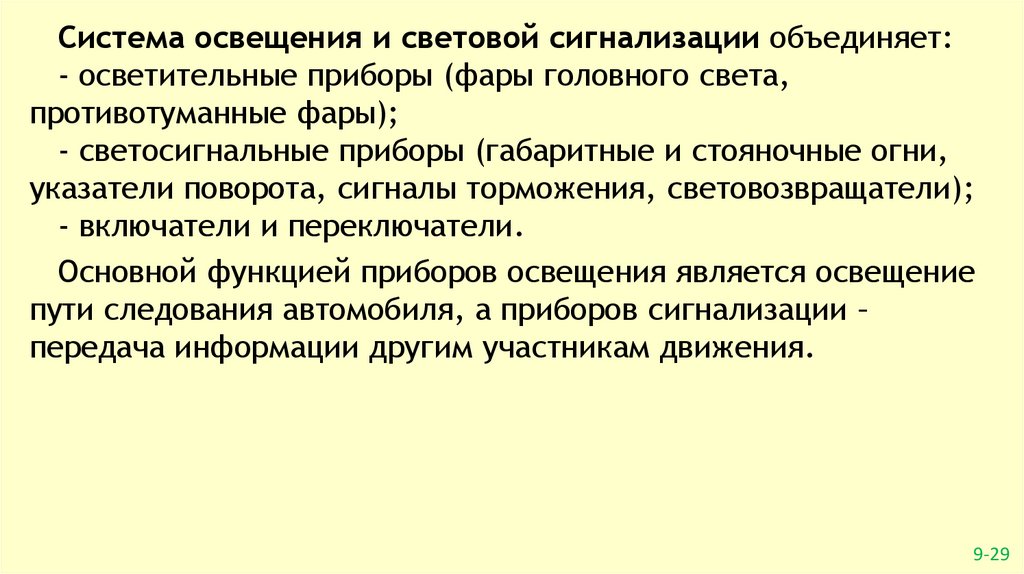 Система освещения и световой сигнализации объединяет:- осветительные приборы (фары головного света,