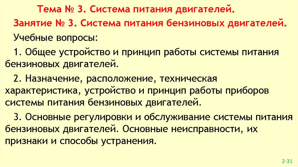 Тема № 3. Система питания двигателей.Занятие № 3. Система питания бензиновых двигателей.