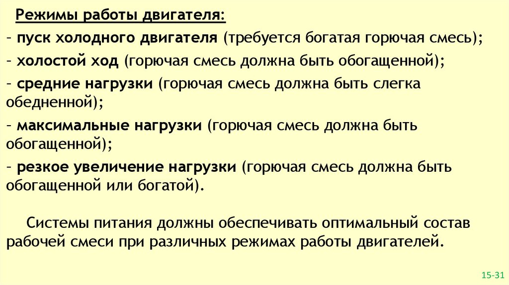 Режимы работы двигателя:– пуск холодного двигателя (требуется богатая горючая смесь);