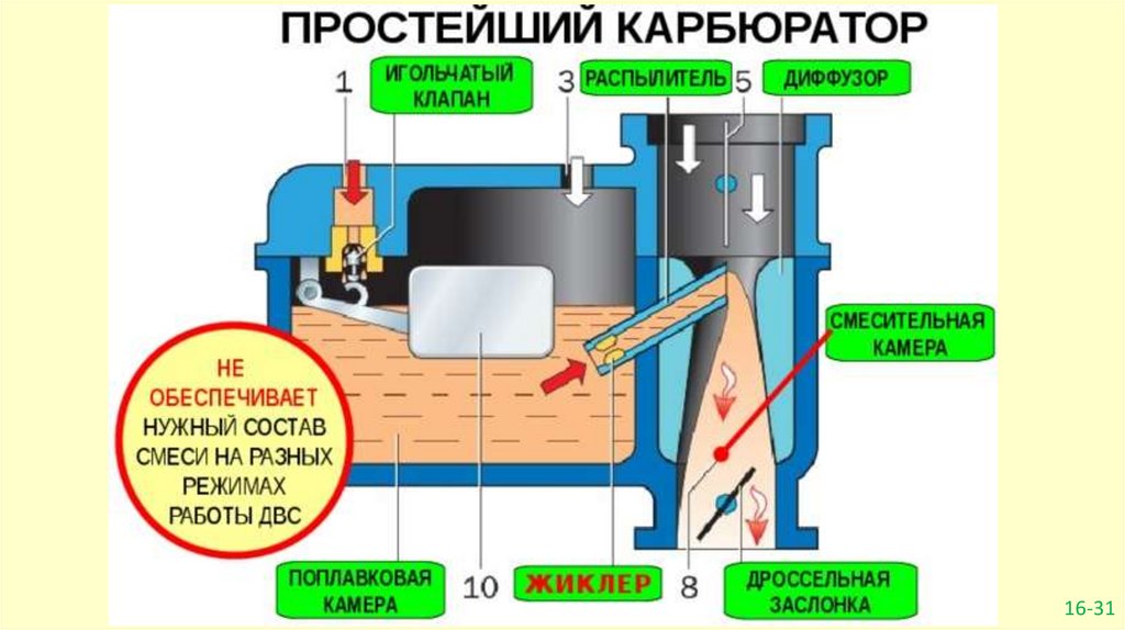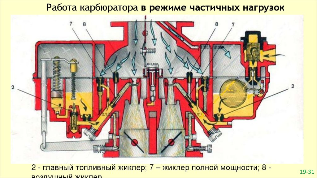 Работа карбюратора в режиме частичных нагрузок2 - главный топливный жиклер; 7 – жиклер полной мощности; 8 -