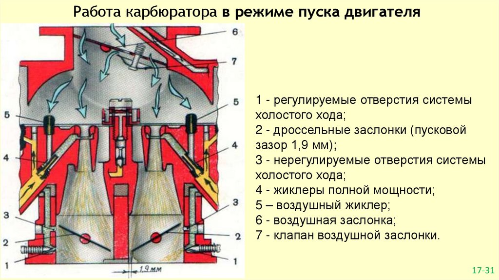 Работа карбюратора в режиме пуска двигателя1 - регулируемые отверстия системы