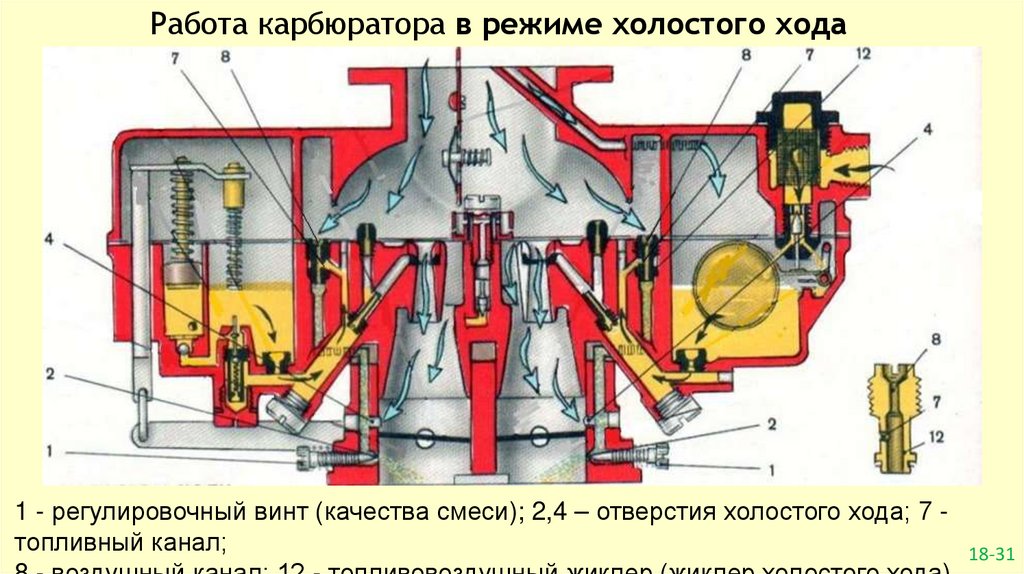 Работа карбюратора в режиме холостого хода1 - регулировочный винт (качества смеси); 2,4 – отверстия холостого хода; 7 топливный канал;