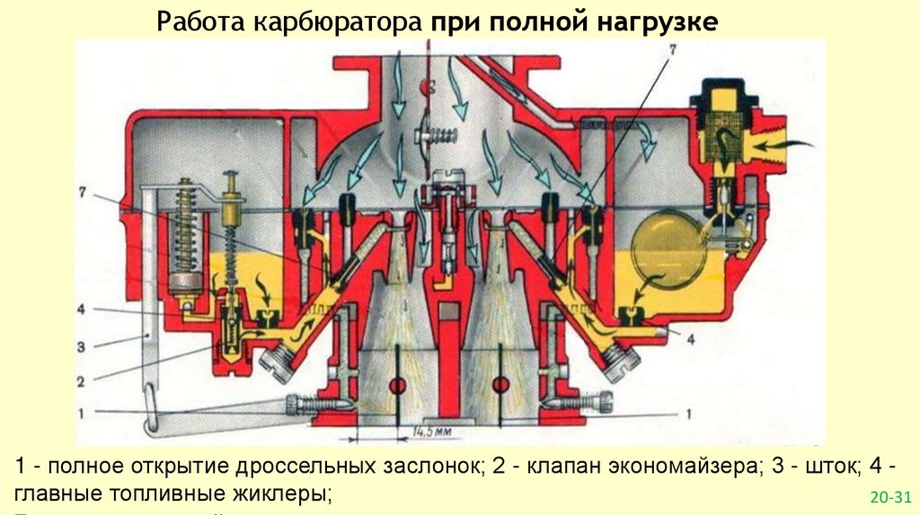 Работа карбюратора при полной нагрузке1 - полное открытие дроссельных заслонок; 2 - клапан экономайзера; 3 - шток; 4 главные топливные жиклеры;