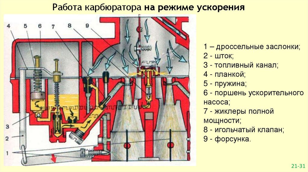 Работа карбюратора на режиме ускорения1 – дроссельные заслонки;