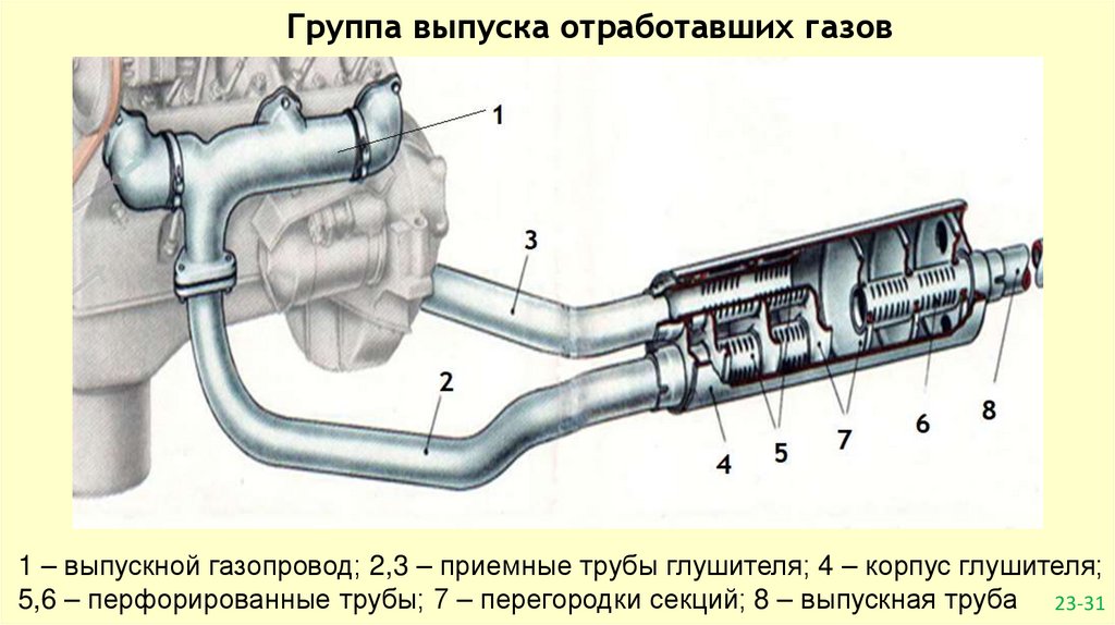 Группа выпуска отработавших газов1 – выпускной газопровод; 2,3 – приемные трубы глушителя; 4 – корпус глушителя;