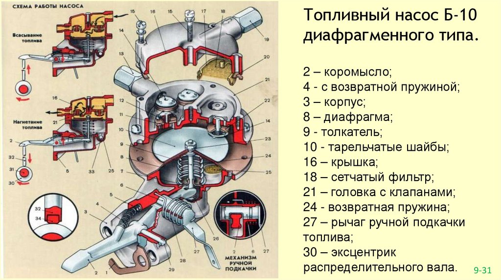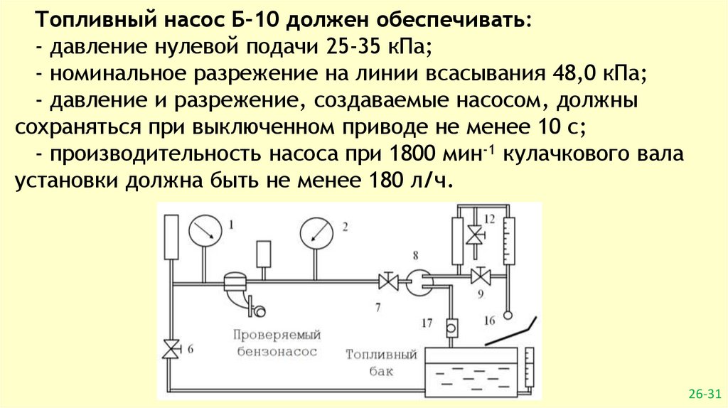 Топливный насос Б-10 должен обеспечивать:- давление нулевой подачи 25-35 кПа;