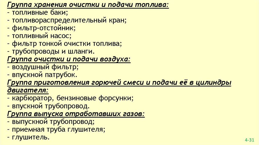 хранения, очистки и подачи топлива, очистки и подачи воздуха,