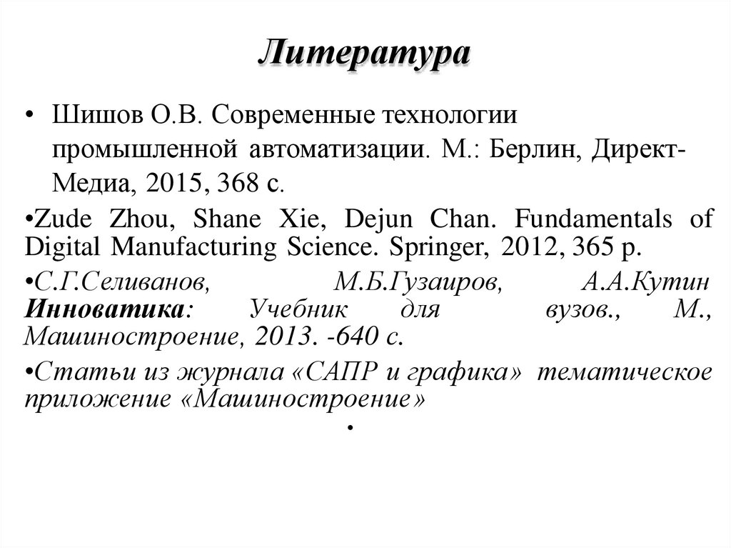 • Шишов О.В. Современные технологиипромышленной автоматизации. М.: Берлин, ДиректМедиа, 2015, 368 с.