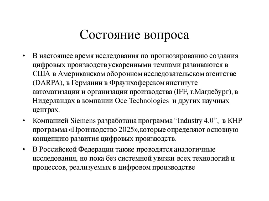 • В настоящее время исследования по прогнозированию созданияцифровых производств ускоренными темпами развиваются в