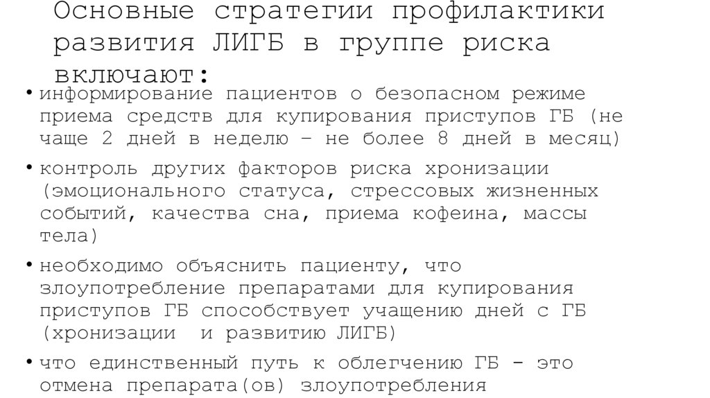 49. Основные стратегии профилактики развития ЛИГБ в группе риска включают: