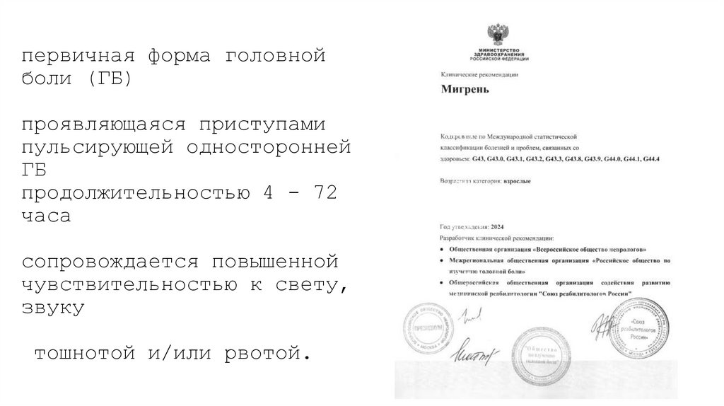 10. первичная форма головной боли (ГБ) проявляющаяся приступами пульсирующей односторонней ГБ продолжительностью 4 - 72 часа