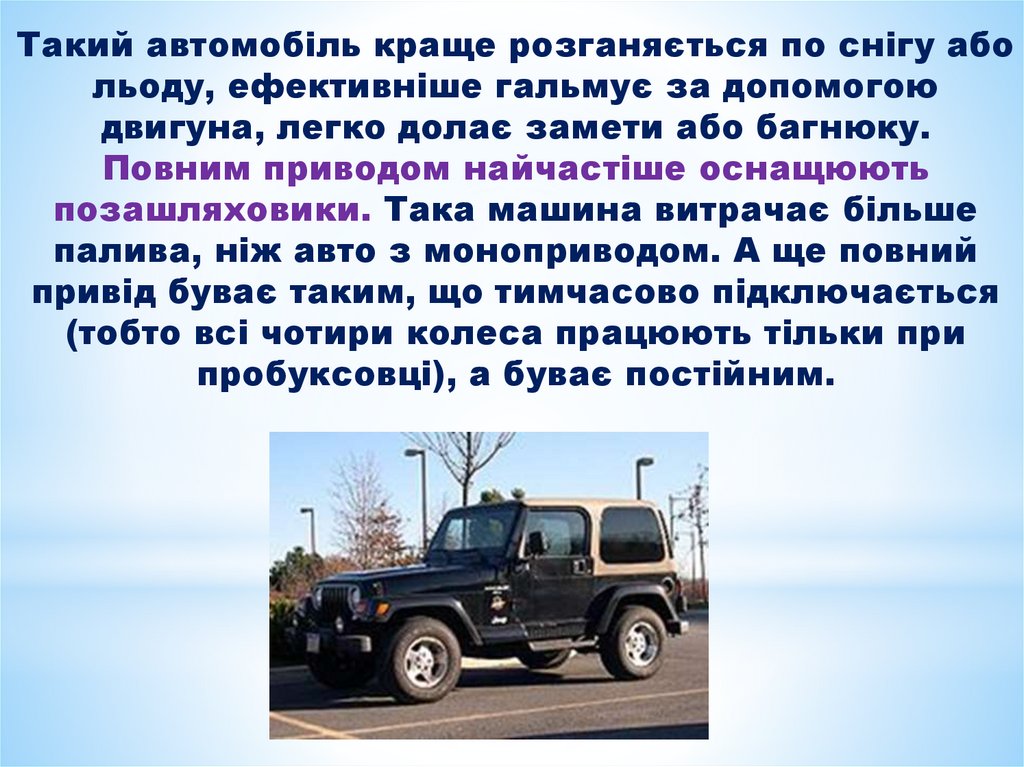 Такий автомобіль краще розганяється по снігу абольоду, ефективніше гальмує за допомогою