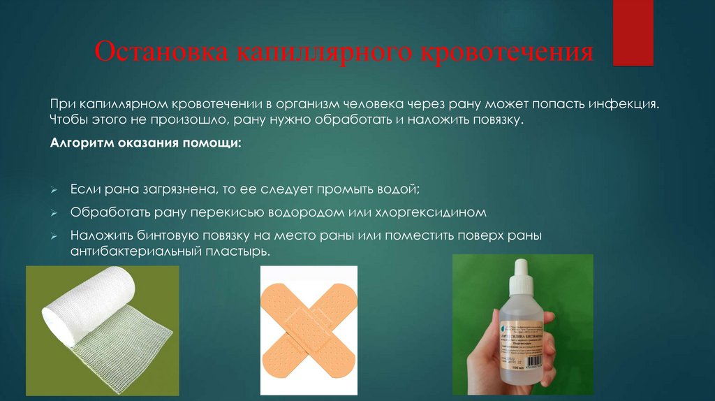 Остановка капиллярного кровотеченияПри капиллярном кровотечении в организм человека через рану может попасть инфекция.
