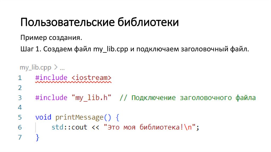 Пример создания.Шаг 1. Создаем файл my_lib.cpp и подключаем заголовочный файл.