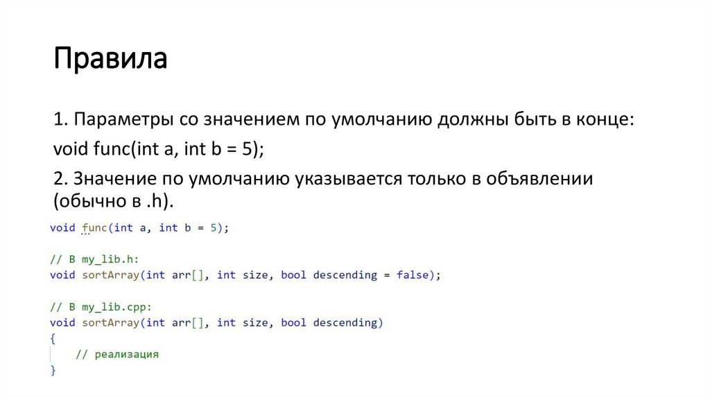 1. Параметры со значением по умолчанию должны быть в конце:void func(int a, int b = 5);