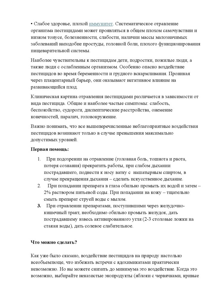 • Слабое здоровье, плохой иммунитет. Систематическое отравлениеорганизма пестицидами может проявляться в общем плохом самочувствии и