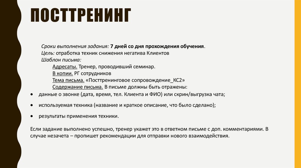 ПОСТТРЕНИНГСроки выполнения задания: 7 дней со дня прохождения обучения.