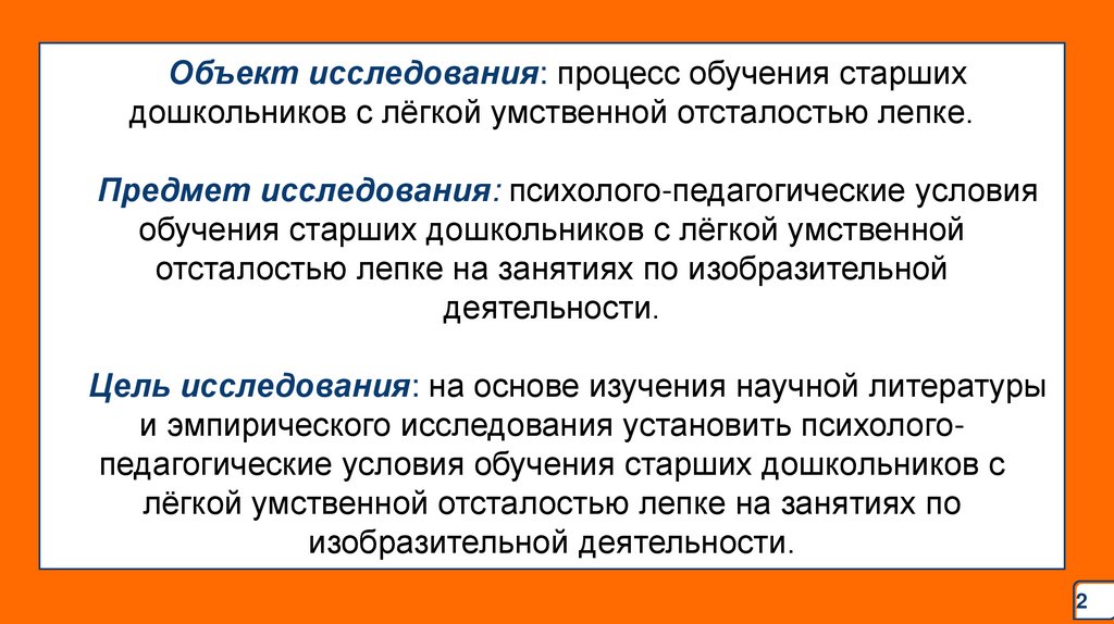 Объект исследования: процесс обучения старшихдошкольников с лёгкой умственной отсталостью лепке.