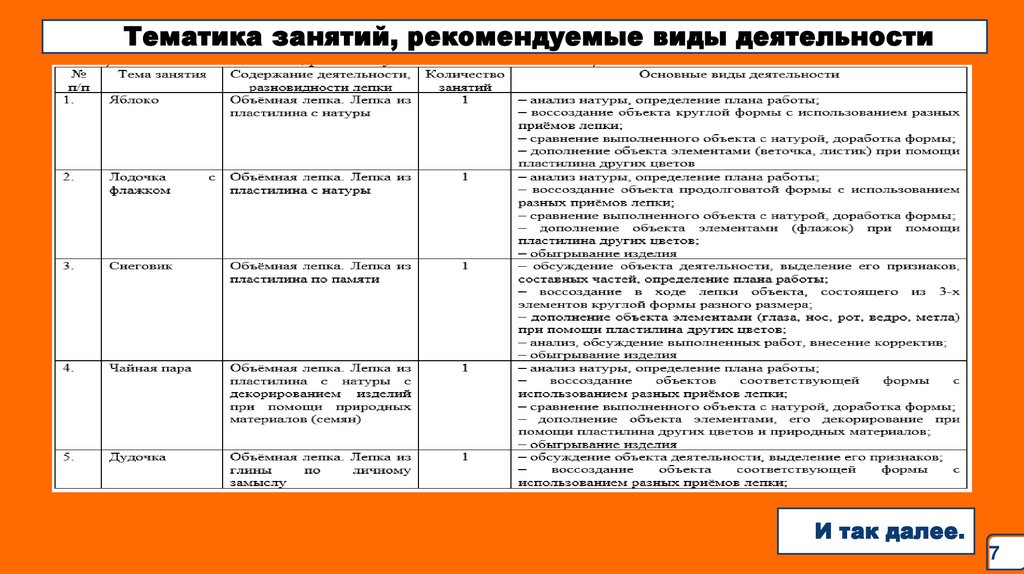 Тематика занятий, рекомендуемые виды деятельностиИ так далее.