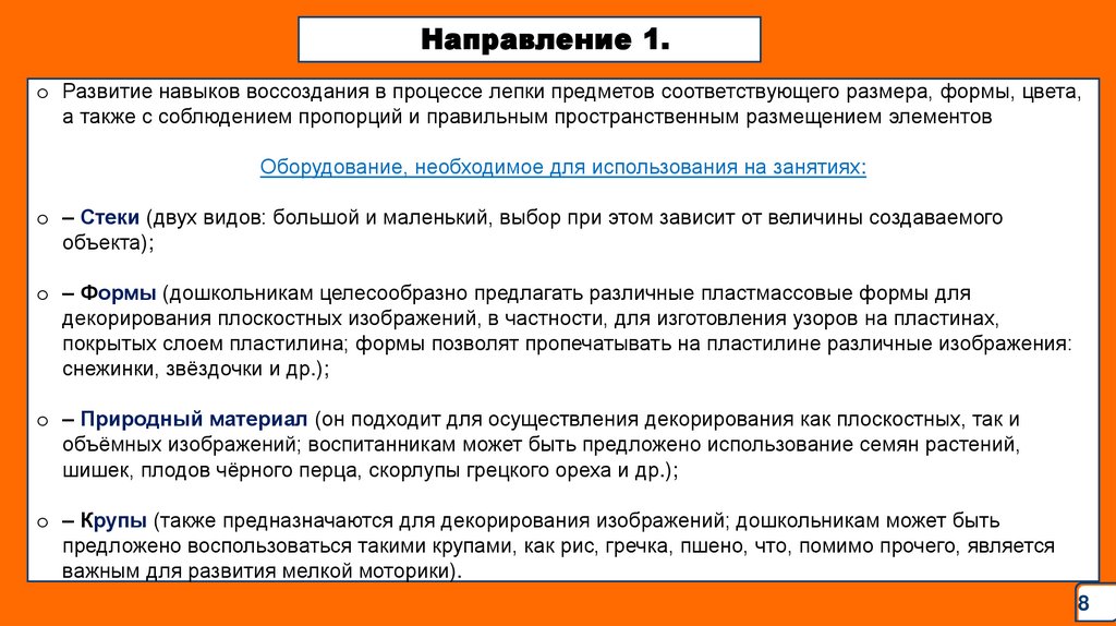 Направление 1.o Развитие навыков воссоздания в процессе лепки предметов соответствующего размера, формы, цвета,